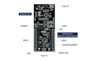 The APM32F403R Micro-EVB is a compact development platform for APM32F403xB basic extended MCUs. It features an APM32F403RBT7 MCU with a 120 MHz Arm® Cortex®-M4F core and 128 KB Flash. The board integrates a Geehy-LINK module and a minimal system, supporting debugging via onboard LINK or direct Type-C connection. It provides accessible I/O pins, buttons, UART, and basic peripherals for quick simulation and programming.