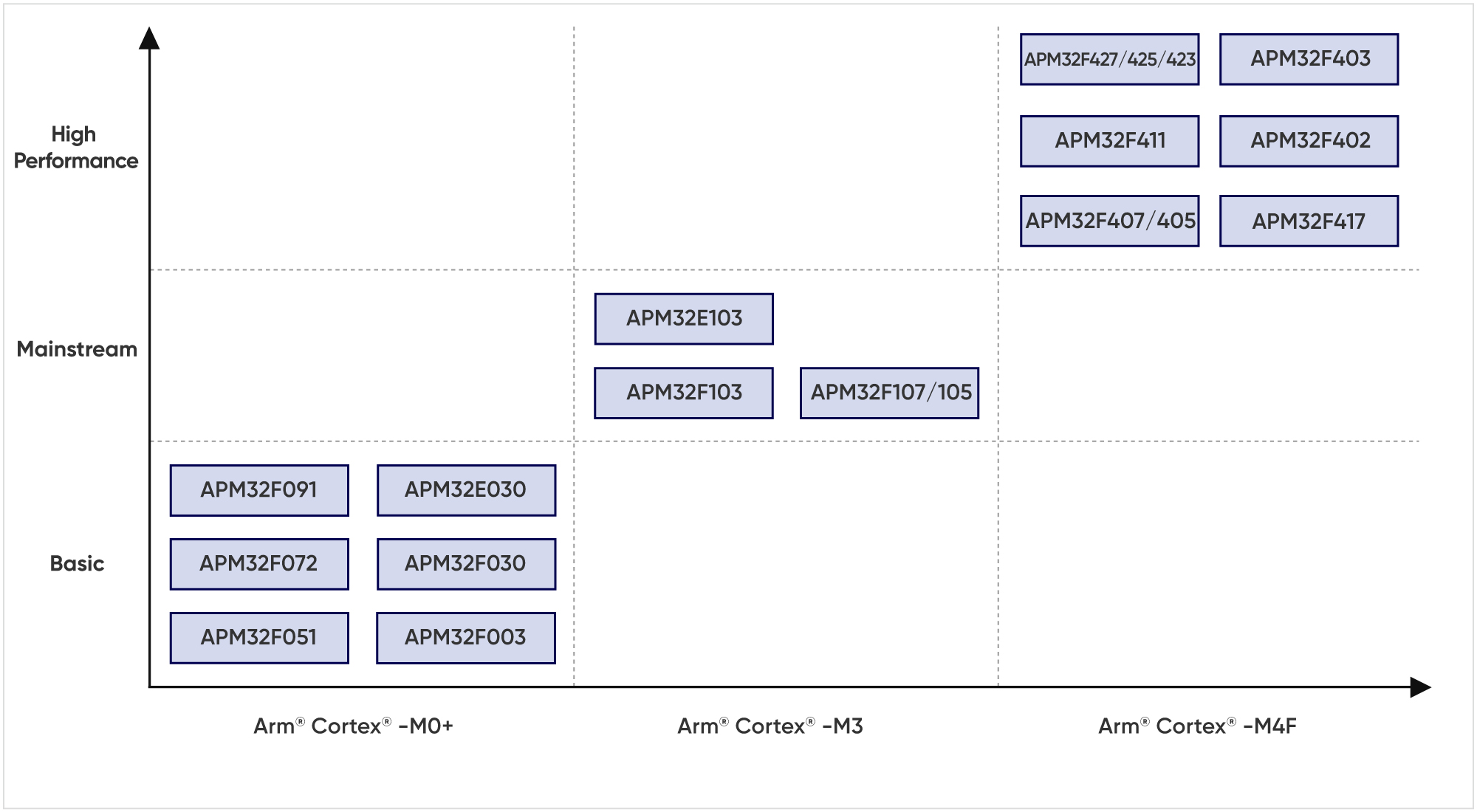 The APM32 series comprises 32-bit MCUs based on Arm Cortex-M0+/M3/M4F cores. These MCUs deliver a blend of high performance, low power consumption, real-time capabilities, stability, security, and versatility, ensuring a rapid, straightforward, and flexible development experience. With diverse models catering to various applications, the APM32 lineup features a robust development ecosystem and finds extensive use in industrial control, automotive electronics, high-end consumer electronics, smart homes, new energy, and communication facilities.