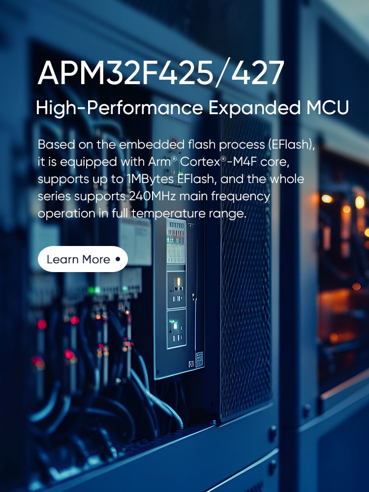 The APM32F425/427 series is a high-performance industrial MCU running at up to 240 MHz. It provides up to 1 MB Flash and 448 KB SRAM. Designed for demanding industrial applications, this series is ideal for PLCs, servo drives, drones, robotics, energy storage BMS, and more.