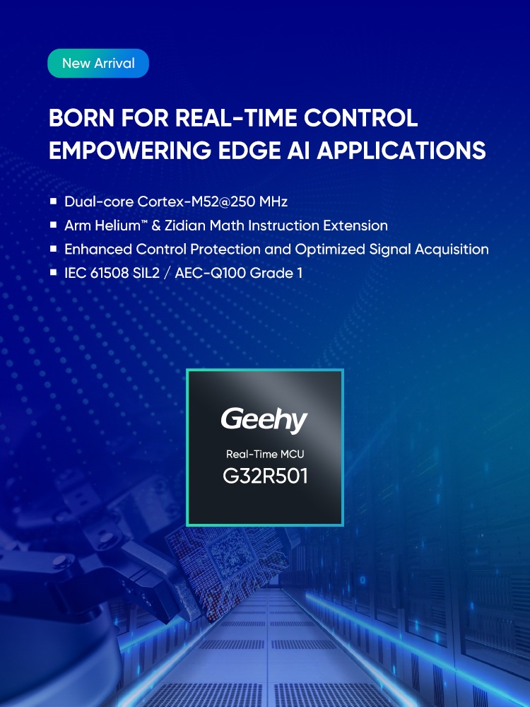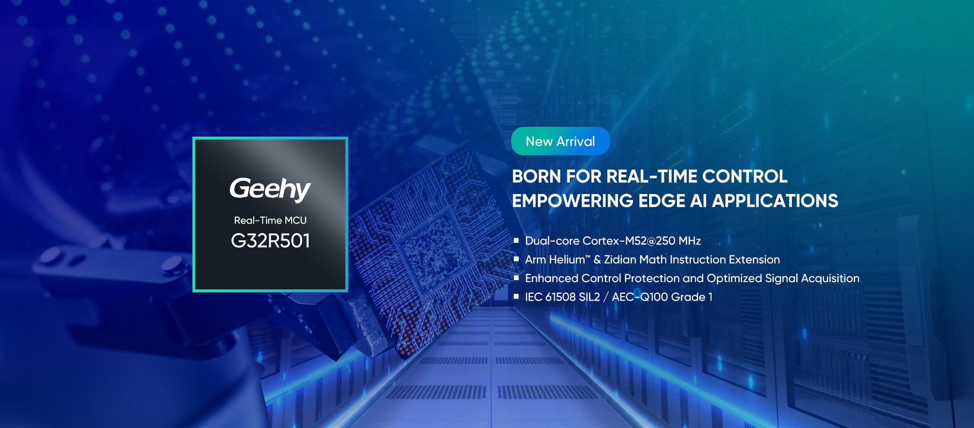The G32R501 series, powered by the Arm® Cortex®-M52 dual-core architecture at 250MHz, features Arm Helium™ technology and Zidian Math Instruction Extension, excelling in precise sensing and control. It's perfect for applications like new energy inverters, industrial automation, and electric vehicles.