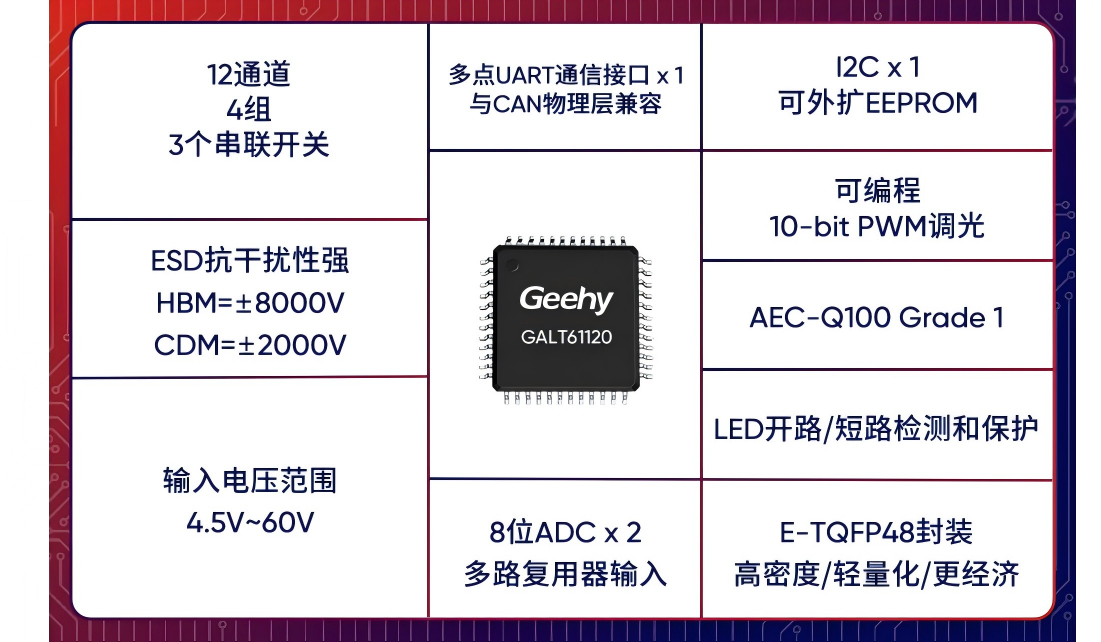 GALT61120支持LED短路和开路故障检测和保护功能,当某路LED出现异常时,主控制器可获取故障信息,并采取措施保障运行安全。其紧凑的封装设计与低功耗特性,更适配汽车大灯的小型化布局需求,助力整车实现轻量化设计。