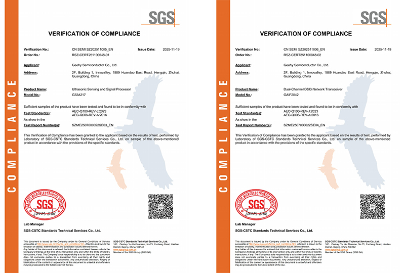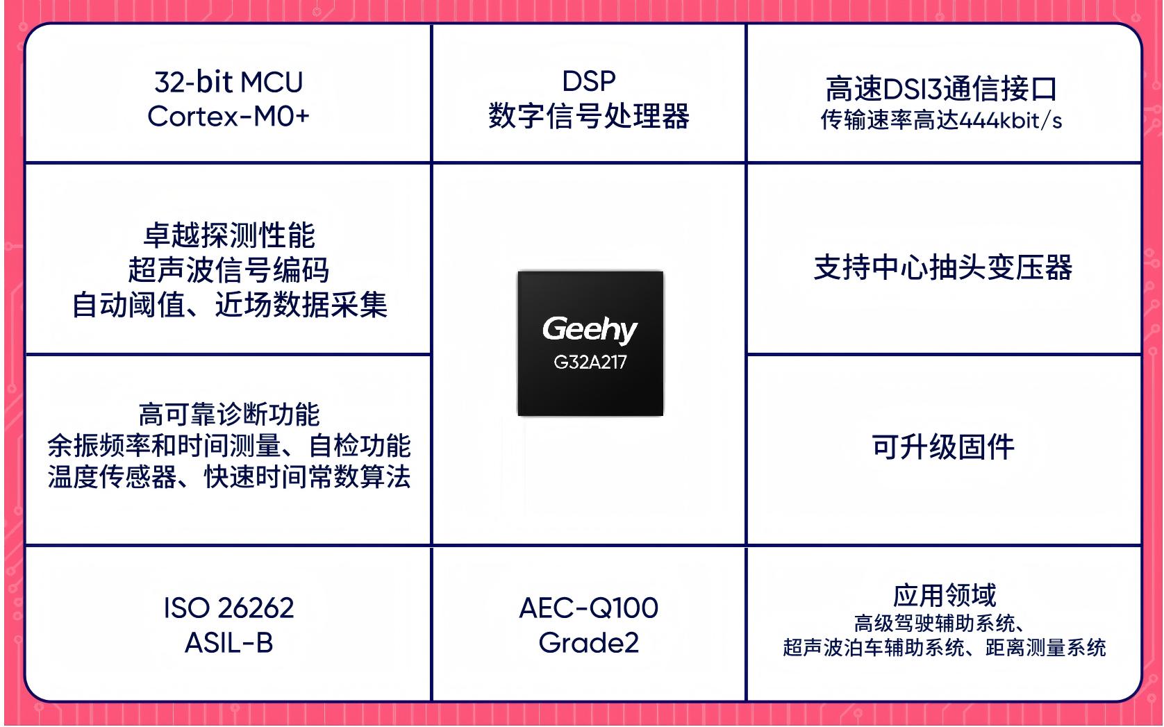 G32A217是全自研国产首款符合AK2标准的超声波传感和信号处理器,内置MCU (Cortex-M0+ )和DSP,集成DSI3总线通信接口,实现独立双通道通信;采用全国产供应链,成功突破国外技术封锁;具备卓越的探测性能,可实现远距离探测、多目标识别、盲区优化等;支持点对点、菊花链、并行等连接方式,实现数据融合与通信,产品通过AEC-Q100 Grade 2车规可靠性认证,于2025年4月与广汽集团联合发布,同年11月宣布进入量产应用阶段。