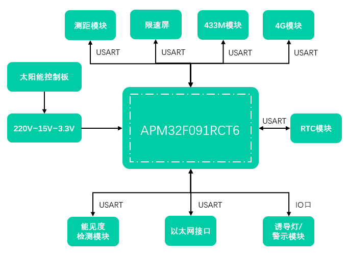 APM32F091RCT6芯片内置多达8个USART接口,可支持外挂多个外设进行同步工作;针对高速雾区导航灯系统应用方案,系统可搭载能见度监测模块、测距模块、RTC模块,实现高精度实时路况监控采集;通过433M模块实现多灯组网通讯,通过4G模块实现远程参数配置,通过以太网模块实现本地参数配置以及多灯组网的网关控制,在多个模块的同步运作下实现系统灵活的控制功能。