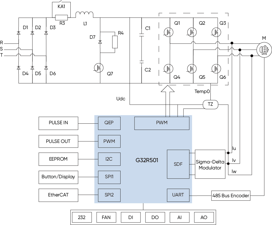 The G32R501 400W EtherCAT Bus-Type High-Voltage Servo Controller Solution is designed with a dual-core architecture, optimizing interrupt handling with CPU0 at 13.6μs and CPU1 at 8.6μs, ensuring superior performance and rich functionality for advanced product designs.