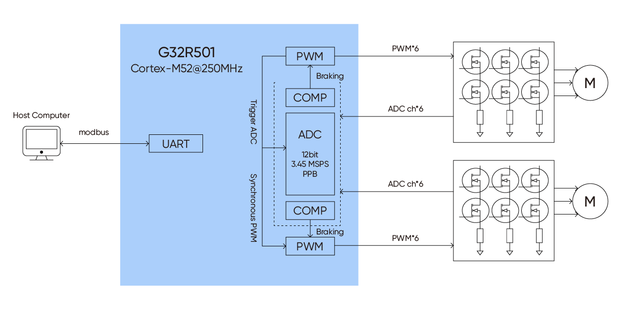 Geehy's G32R501 low-voltage sensorless dual-motor solution leverages the newly launched G32R501 real-time MCU. The solution enables dual-motor sensorless FOC control, offering a highly responsive and precise system with a single core completing current loop control in just 24.8μs. It integrates key features such as motor parameter identification and adaptive control, supporting a wide range of permanent magnet synchronous motors.