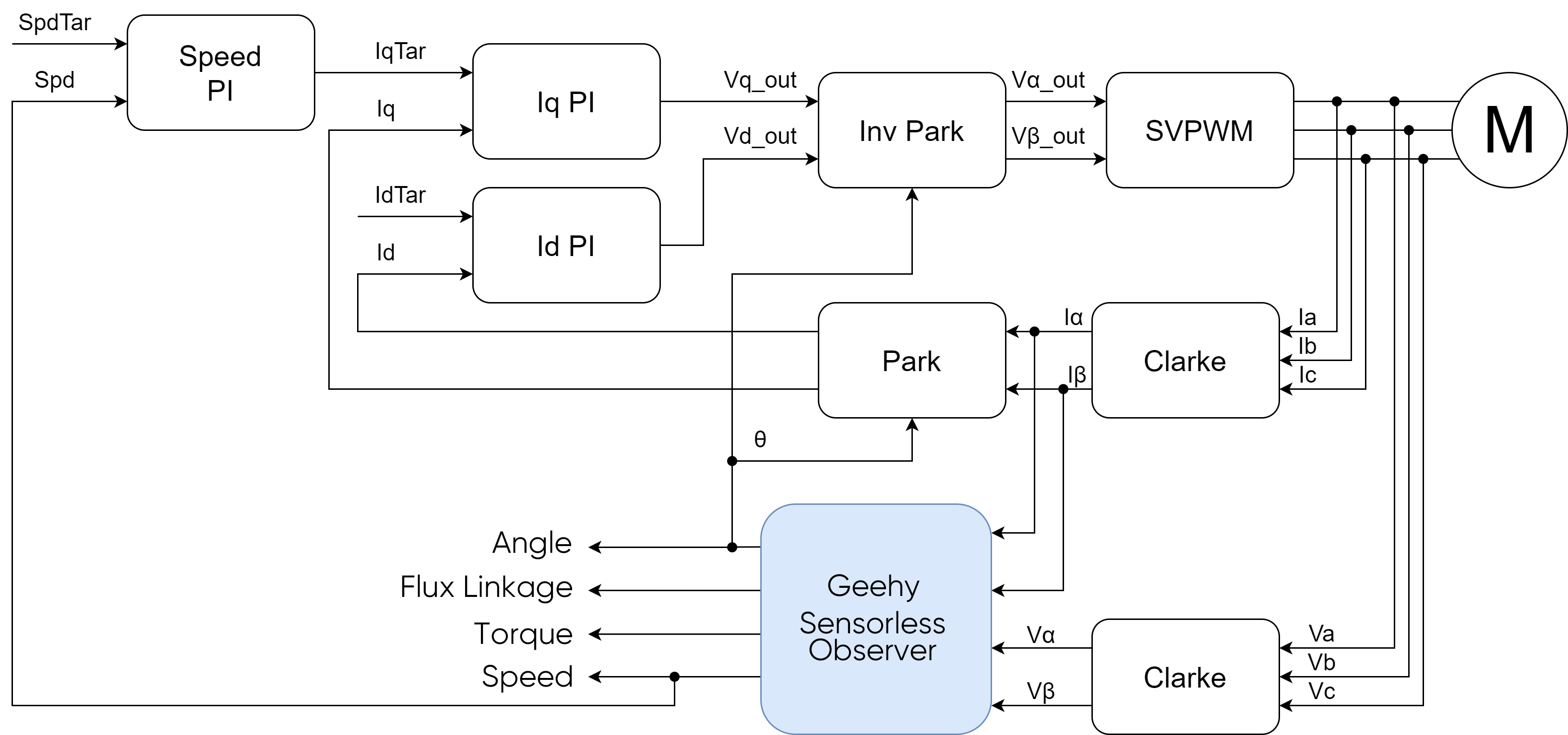 - Feedback Signals: Monitors flux linkage, angle, speed, and torque for precise control.