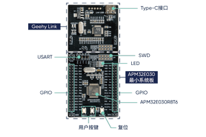 APM32E030R Micro-EVB开发板是基础拓展型APM32E030x8系列MCU的最小系统演示板和开发平台,搭载一颗APM32E030R8T6 MCU 芯片。该芯片基于Arm® Cortex®-M0+内核、工作主频72MHz、Flash 64KB。开发板由Geehy-LINK和E030最小系统板两部分组成。开发板支持板载LINK或Type-C直连等多种调试方式,并预留外接IO、按键、串口等基本外设功能,方便用户快速上手进行仿真和下载程序。