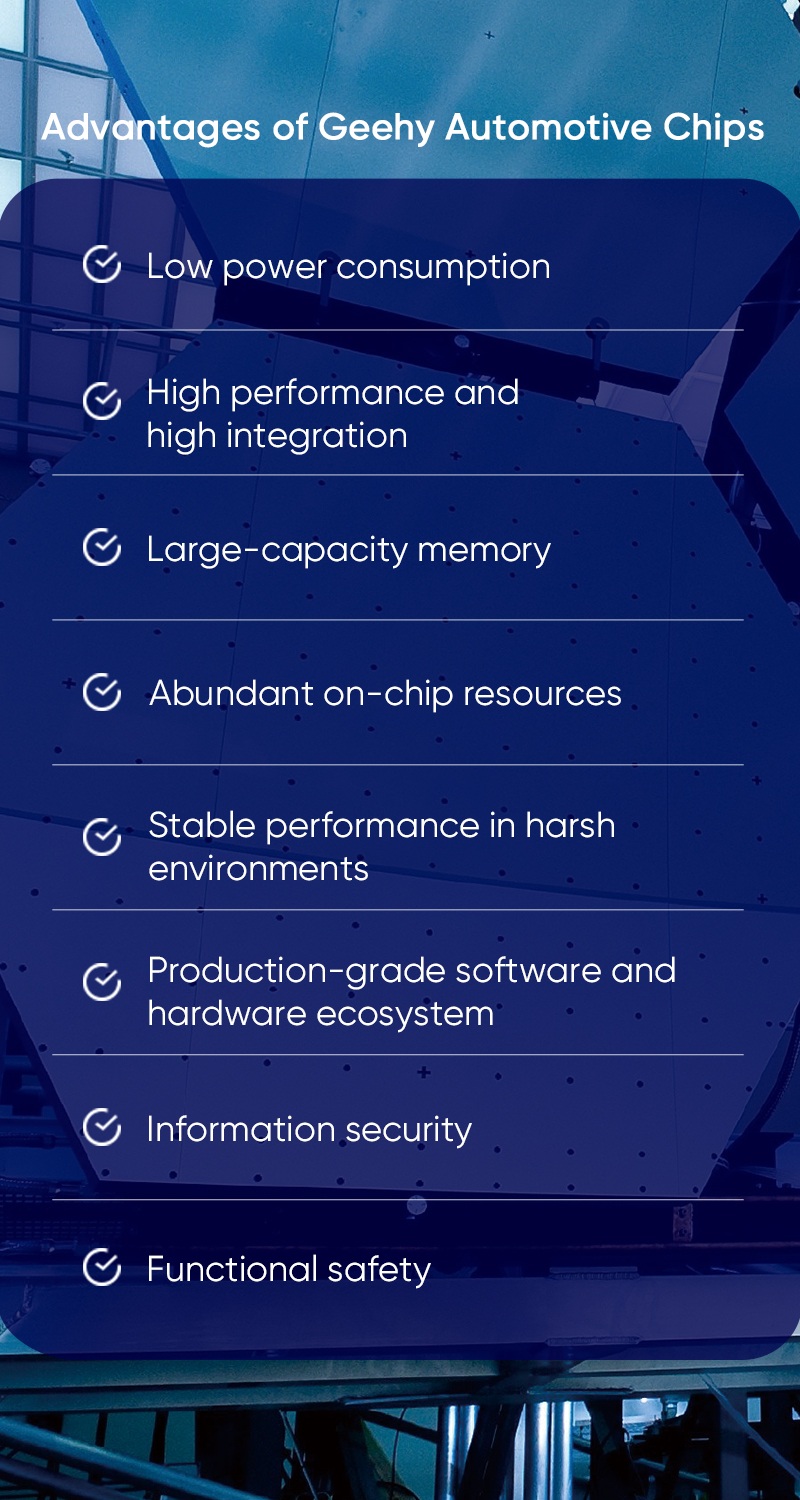 Geehy's automotive chip lineup spans microcontrollers, microprocessors, sensors, interfaces, and drivers, strategically focused on key areas like body control, infotainment systems, BMS, and domain control. Committed to ISO 26262 functional safety standards, Geehy ensures safety, reliability, and quality in its chip products and application solutions. Alongside functional safety, Geehy provides a robust development ecosystem and localized technical support, coupled with a diverse product portfolio, effectively meeting evolving application demands in the automotive electronics industry.