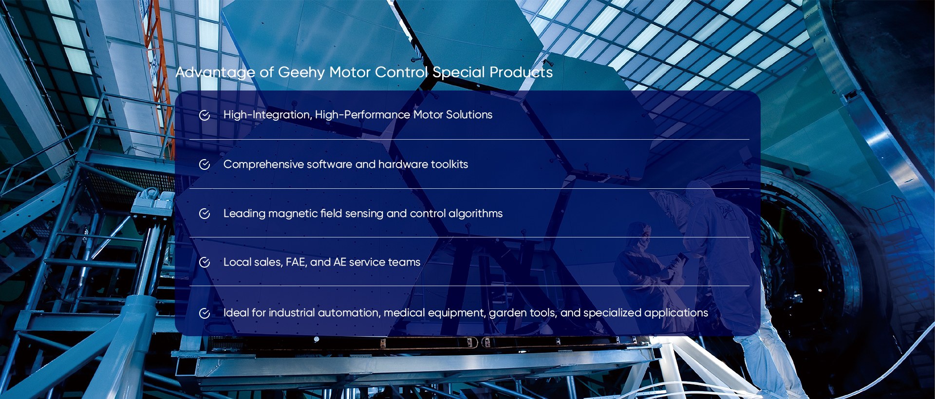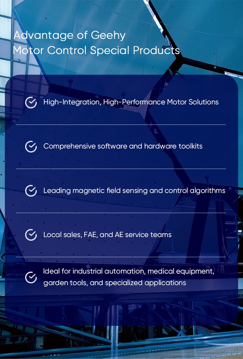 Geehy provides motor control-dedicated MCUs and gate drivers that offer high integration, performance, and cost-efficiency. Our products, supported by versatile development tools and professional technical assistance, simplify design, reduce costs, and speed up product deployment.