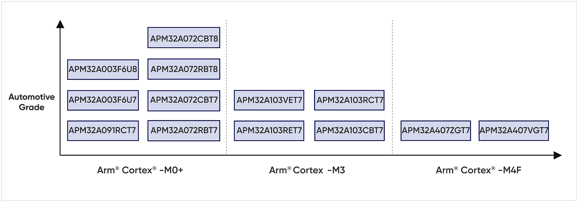 The APM32A series, including APM32A407, APM32A103, and APM32A091, features six products equipped with Arm® Cortex®-M0+/M3/M4F cores. These MCUs provide efficient CPU processing, enhanced storage, and robust connectivity. With AEC-Q100 and ISO 26262 certifications, the APM32A series expands Geehy's automotive-grade MCU lineup, meeting high-reliability standards and accommodating a wide temperature range. It is designed to address diverse communication and body control applications, finding applications in vehicle body control, safety systems, infotainment, power systems, and more.